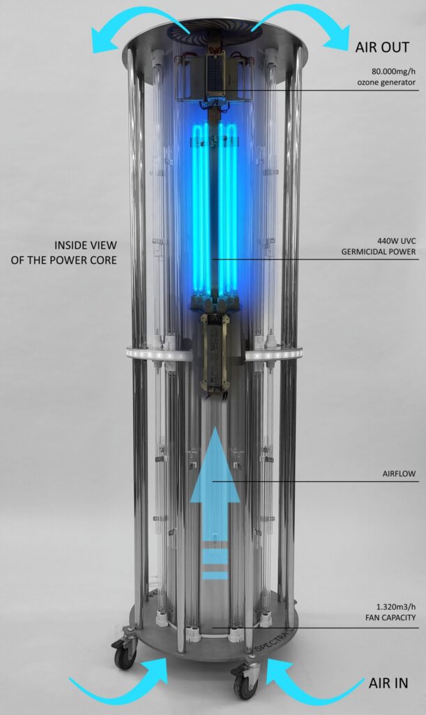 Het apparaat is ontworpen voor een zeer snelle en efficiënte desinfectie van de gehele ruimte en dit wordt verzekerd door UVC-lampen met een hoog vermogen van 1.760 W.